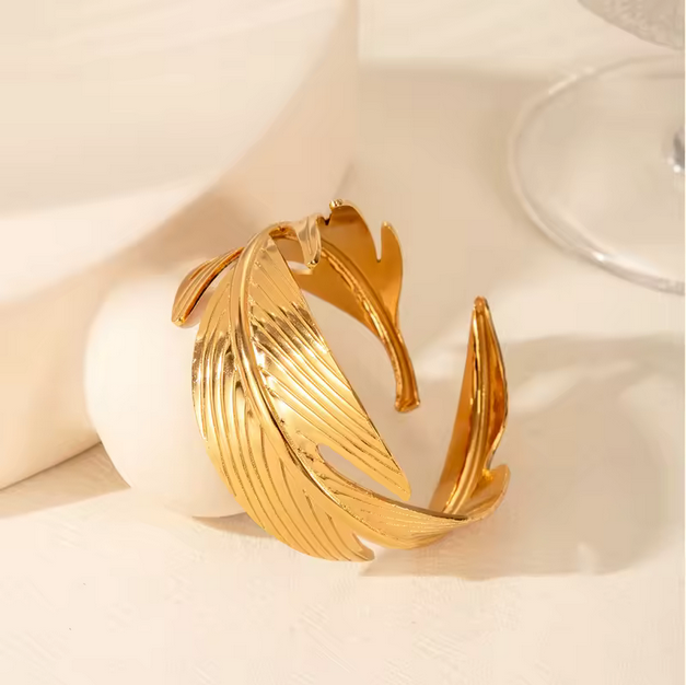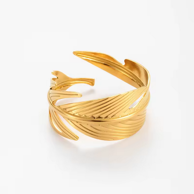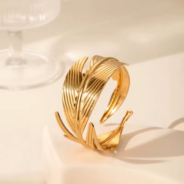 Ένα εντυπωσιακό δαχτυλίδι που συνδυάζει τη φυσική αρμονία με τη σύγχρονη αισθητική. Το χρυσό δαχτυλίδι σε σχέδιο φύλλου ξεχωρίζει για τις ανάγλυφες λεπτομέρειες και τη ρευστή του φόρμα, προσδίδοντας κομψότητα και κίνηση σε κάθε χέρι.