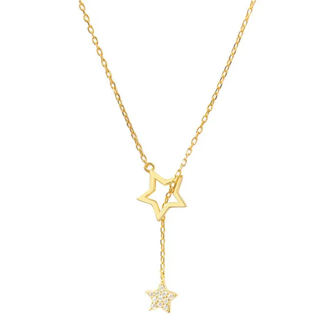 Σαν ένα αστραφτερό μυθικό ταξίδι, το κολιέ μας ξεχωρίζει με το μαγικό του σχέδιο. Ένα αστέρι με λαμπερές πέτρες, ενσωματώνεται μέσα σε ένα άλλο αστέρι, δημιουργώντας έναν ασύμμετρο χορό λάμψης. Η χρυσή αίγλη προσθέτει μια δόση θεατρικότητας σε αυτό το κόσμημα που θα σας ταξιδέψει σε άλλες διαστάσεις. Αποκτήστε τη λάμψη του σύμπαντος με αυτό το μοναδικό κολιέ!