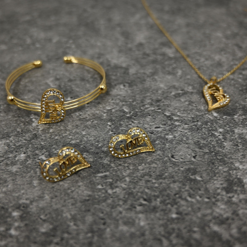 Σας παρουσιάζουμε το Love σετ μας, ένα συναρπαστικό κουαρτέτο που αποτυπώνει όμορφα την ουσία του ρομαντισμού σε κάθε κομμάτι. Τα σκουλαρίκια σε σχήμα καρδιάς, στολισμένα με λεπτές πέτρες, πλαισιώνουν κομψά το πρόσωπό σας με μια πινελιά λάμψης. Τα συμπληρώνει ένα ασορτί βραχιόλι, όπου η αγάπη βρίσκεται στο επίκεντρο σε ένα γοητευτικό και εκλεπτυσμένο σχέδιο. Το κολιέ συνεχίζει το θέμα, με ένα μενταγιόν σε σχήμα καρδιάς που κοσμεί με χάρη το ντεκολτέ σας. Ολοκληρώνοντας το σετ είναι ένα εντυπωσιακό δαχτυλίδι, με κεντρικό κομμάτι εμπνευσμένο από την αγάπη που προσθέτει μια πινελιά αίσθησης στα δάχτυλά σας. Αφεθείτε στη γλώσσα της αγάπης με την προσεκτικά επιμελημένη Love συλλογή μας, όπου κάθε κομμάτι εναρμονίζεται για να δημιουργήσει μια συμφωνία ρομαντισμού και στυλ. Ανεβάστε το σύνολό σας με αυτό το συντονισμένο σύνολο που συνδυάζει όμορφα το πάθος και τη μόδα.